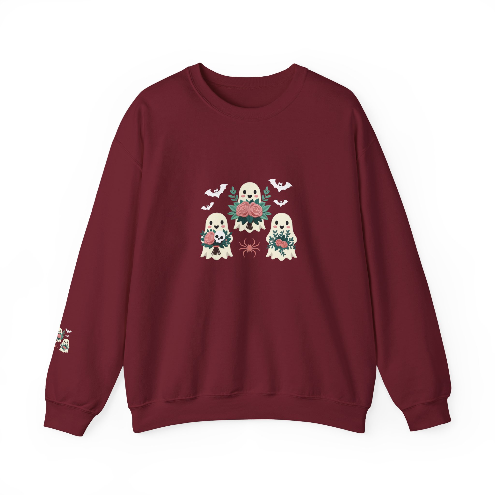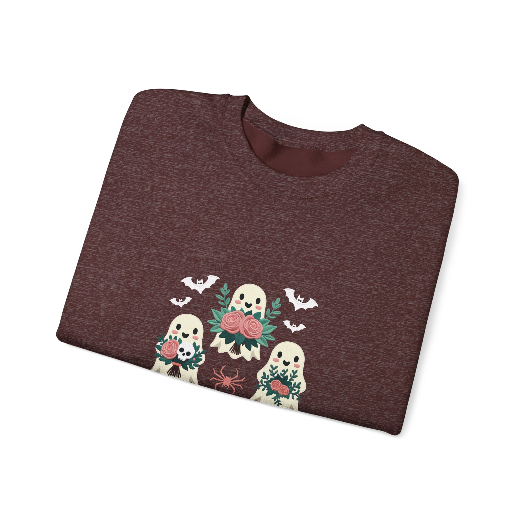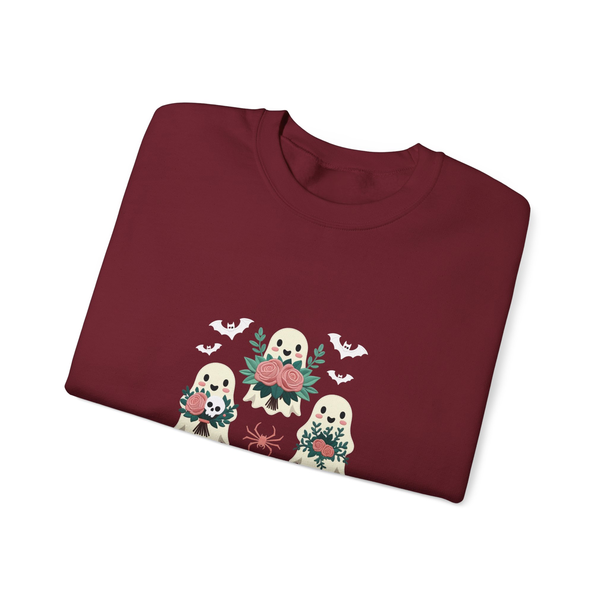 This is more than just a Halloween top; it’s a celebration of friendship and fall comfort, featuring three charming, flower-toting ghosts on a deep Maroon crewneck.